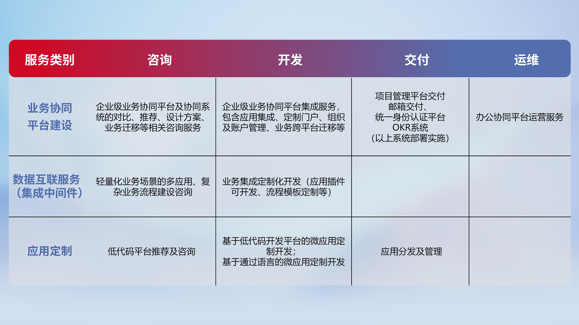 针对钉钉、、企微、、、IDaas等平台级产品提供产品的规划、、、方案、、、、交付、、、定制化开发等服务,,,,实现如统一协同办公、、智能客户服务、、、、混合会议管理、、、智能数据查询、、等业务场景,,,实现数字化转型。。。。
